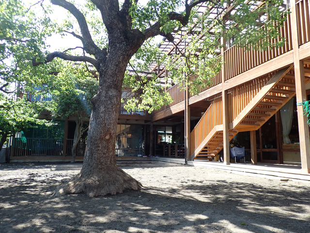 木の温もりが感じられる園舎には、ヒノキとナラ材が使用されています。広めのテラスや窓により、自然を体感しやすい造りとなっています。家庭的な雰囲気の中で、一人一人の子どもの気持ちを受けとめ、子どもの主体性の発揮や友だちとの豊かな関わりを大切にしながら保育を行います。